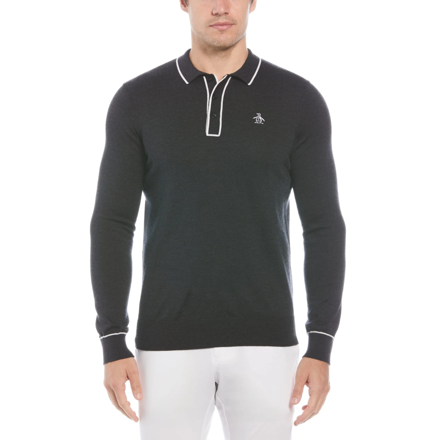 Made with luxuriously soft, naturally moisture wicking merino wool blend fabric, this Original Penguin sweater for men offers an exceptional balance of style and comfort. Piping at the collar, placket and cuffs adds contrast to the solid-colored design of the men’s sweater for a sophisticated yet casual look. A hint of stretch in the material helps to ensure a flexible fit and unrestricted movement, while a sticker-inspired logo on the chest adds a fun finishing touch.